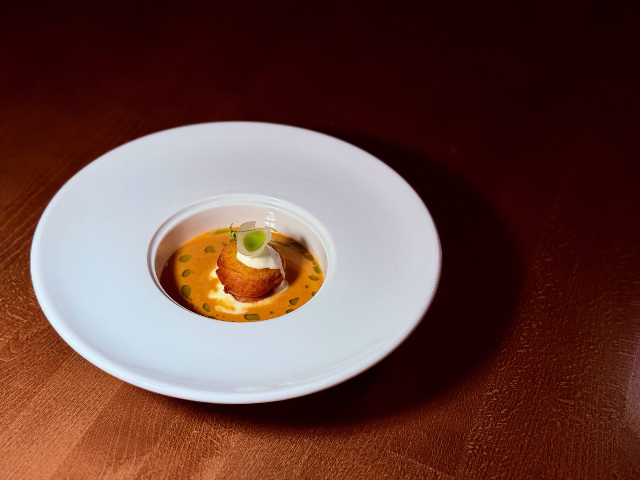 Crab Soufflé Beignet with Rock Shrimp Bisquew, Crème Fraîche, Pearl Onion, Tarragon